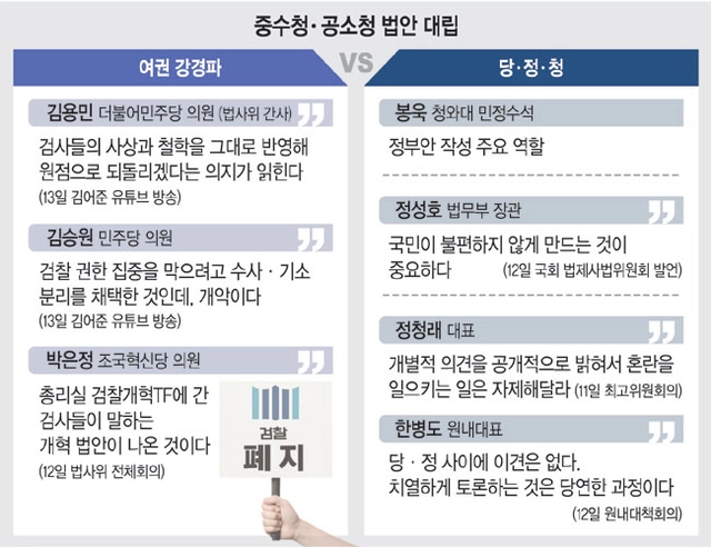 더불어민주당 강경파가 정부의 중대범죄수사청(중수청)·공소청 신설 법안에 대해 국회 법제사법위원회에서의 법안 수정을 예고한 데 이어, 반대 여론전까지 벌이면서 13일 소위 ‘검찰개혁’을 둘러싼 당·정 및 당내 갈등이 커지는 모습이다. 강경파 일부가 봉욱 민정수석 등 검찰 출신 청와대 인사까지 겨냥하면서 당·청 갈등으로 번지는 데 대한 당내 우려도 감지된다.