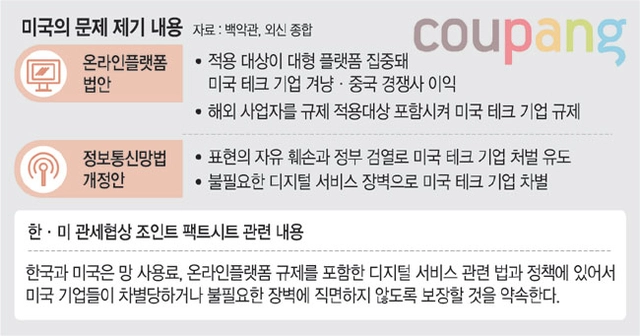 미국 연방 의회는 13일(현지시간) 각국의 디지털 규제와 이로 인한 미국 기업의 부정적 영향에 대한 청문회를 열면서 한국 국회의 정보통신망법 개정안(허위조작정보근절법)과 쿠팡의 개인정보 유출 사건과 관련해 비판 목소리를 높였다. 여한구 산업통상부 통상교섭본부장이 미국 정계의 우려를 불식시키기 위해 급하게 미국을 찾았지만 일단 미 의회는 초당적으로 한국의 디지털 규제를 미국 기업에 대한 차별로 규정하는 모습이다. 이에 따라 지난해 11월 ‘한·미 관세·안보 분야 조인트 팩트시트’ 발표로 마무리되는 듯했던 한·미 통상 문제가 다시금 갈등 국면으로 바뀔 수 있다는 우려도 나온다.