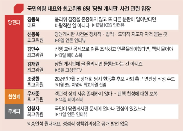 사실상 윤리위 결정을 수용할 뜻을 내비친 것으로 풀이된다. 지도부에 따르면 장 대표는 당원게시판 논란을 정치적으로 풀기 위해서는 당사자인 한 전 대표가 당원에게 진정성 있는 사과를 해야 한다는 생각인 것으로 전해졌다. 한 전 대표가 당무감사위원회 조사 결과를 두고도 조작을 주장하는 등 강경 대응으로 맞서면서 이미 정치적 해결은 불가능해졌다는 게 장 대표 측 기류다.
