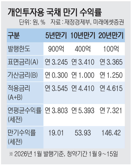 이 같은 변화의 배경에는 정부의 금리 정책이 자리 잡고 있다. 재정경제부는 지난해 12월 청약이 저조했던 장기물의 가산금리를 1.25%포인트까지 확대 적용하며 개인에게는 장기 저축 수단을 제공하고 국채 수요 기반은 넓히는 승부수를 던졌다. 이에 따라 20년물 적용금리는 연 4.615%에 달하며 만기 보유 시 세전 수익률은 원금의 약 2.5배인 146.42%에 이른다.