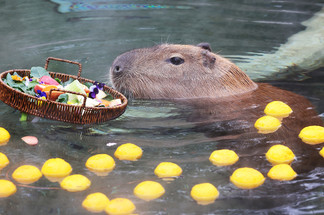 15일 경기 용인시 에버랜드에서 카피바라가 온천욕을 즐기며 사육사들이 준비한 유자와 과일 등 특식을 즐기고 있다.