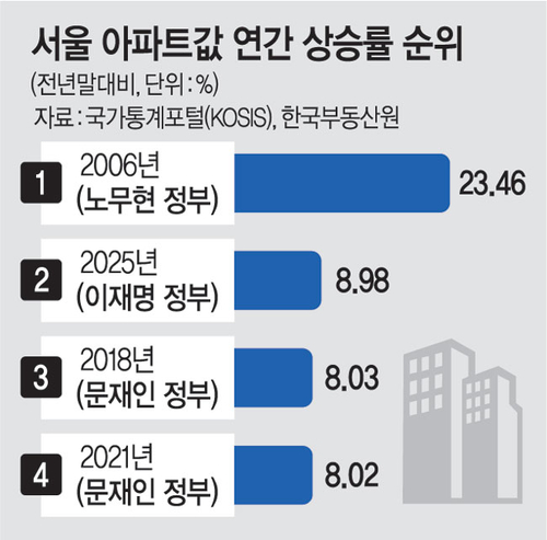 현재 통계가 존재하는 2004년 이후 서울 아파트 매매 가격 연간 상승률이 가장 높았던 해는 노무현 정부 시기인 2006년, 이재명 정부 시기인 2025년에 이어 문재인 정부 시기인 2018년(8.03%), 2021년(8.02%) 순으로 나타났다. 서울 아파트 매매 가격 연간 상승률이 가장 높았던 4년이 모두 진보 정부가 집권하던 시기였다는 뜻이다.