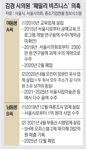 더불어민주당 출신 강선우 무소속 국회의원에게 ‘공천헌금’ 1억 원을 건넨 혐의를 받는 김경 서울시의원의 가족들이 직접 운영하거나 관련된 회사들이 서울시 산하기관 용역을 경쟁 없이 줄지어 따낸 것으로 드러나 특혜 의혹이 거세지고 있다. 김 시의원 막내 여동생 A 씨가 운영하던 업체는 전임 서울시장 시절 수의계약으로 연구용역을 따낸 뒤, 이듬해 곧바로 폐업신고를 하며 ‘먹튀’ 의혹도 받고 있다. 서울시는 김 시의원이 가족 기업에 서울시 사업을 연결해줬을 가능성이 있다고 보고, 자체 감사에 착수하기로 했다.