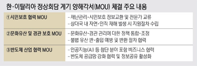 앞서 한·이탈리아는 지난해 9월 서울에서 양국 간 비즈니스 포럼을 열고 첨단산업과 항공·우주, 에너지 전환과 바이오산업 등 4개 분야에서 협력을 강화하기로 뜻을 모은 바 있다. 양국은 이날 문화유산 및 경관 보호 MOU, 시민보호 협력 MOU도 체결했다. 문화유산과 관련한 불법 반·출입을 예방하고, 상대국에 재해가 발생한 경우 지원 절차를 수립하는 내용 등이 담겼다.