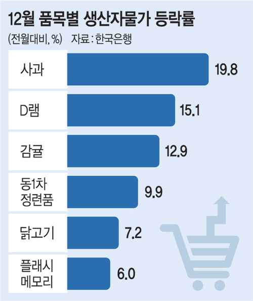세부 품목으로는 사과(19.8%)·감귤(12.9%)·닭고기(7.2%)·물오징어(6.1%)·D램(15.1%)·플래시메모리(6.0%)·동(구리)1차정련품(9.9%)이 급등했다. 반대로 경유(-7.3%)·나프타(-3.8%) 등은 떨어졌다.