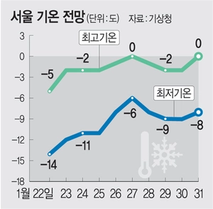 기상청 단기·중기예보에 따르면, 서울 등 수도권의 주말 동안 최저기온은 영하 10∼15도, 최저기온은 영하 3∼5도를 기록할 것으로 보이며 1월 말까지 낮 최고기온 또한 영하 3∼0도 사이를 기록할 것으로 예상된다. 2월 1일이 돼야 낮 최고기온이 영상권에 접어들 것으로 예측된다. 다만, 1월 중순 남부 지역에 유례없는 기온 상승 현상이 나타난 것처럼 이동성고기압 이동에 따라 기온이 조기에 상승할 수도 있다.