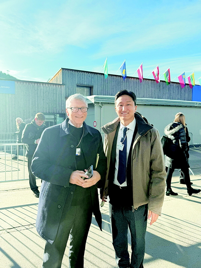 정기선(오른쪽) HD현대 회장이 22일 스위스 다보스에서 열린 세계경제포럼(WEF·다보스포럼)에서 빌 게이츠 테라파워 창립자 겸 회장과 만나 기념촬영을 하고 있다. HD현대는 4세대 원전 기술을 보유한 테라파워와 소형모듈원자로(SMR) 분야에서 협업을 확대하고 있다.