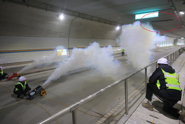 4일 부산 만덕∼센텀 도시고속화도로 터널 내부에서 화재 대비 제연 훈련이 진행되고 있다. 천장의 붉은색 동그라미 부분이 연기를 빨아들이는 제연설비다.
