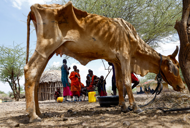 5일 케냐 남부 마가디 마을에서 마사이족 주민들이 지난해 10월부터 이어진 가뭄으로 뼈만 앙상하게 남은 채 여물을 먹는 소를 지켜보고 있다.