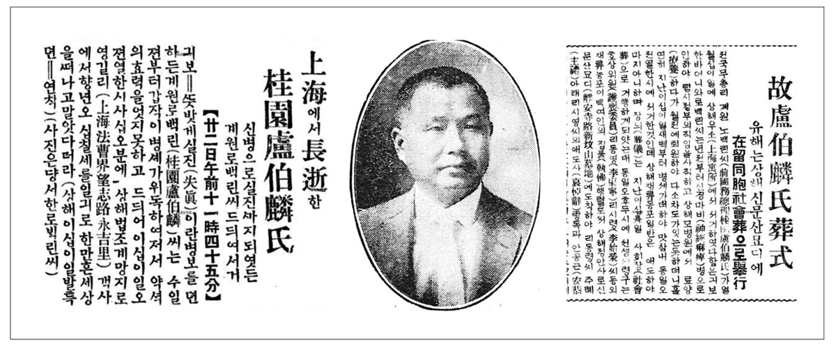 “전 상해임시정부 국무총리 계원 노백린 씨가 상해 우소(寓所·임시로 몸을 붙여 사는 곳)에서 서거하였다 함은 기보한 바어니와 노백린 씨는 연전부터 신경마비병으로 인하여 임시정부의 직임(職任)을 사직하고 상해 모(某) 병원에서 요양해 왔다. 월전(月前)에 퇴원하여 다소 차도가 있는 듯하더니, 홀연히 지난 1월 22일 새벽부터 병세가 더하여 마침내 동일 오전 11시에 서거한 것인데 상해 재류(在留·체류) 동포 일반은 애도하여 마지아니하며 장의(葬儀)는 지난 26일 사회장으로 거행하게 되었다. 동일 오후 2시에 선생의 영구(靈柩)는 호상(護喪)위원 이동녕, 이시영 씨 등 외 재류 동포 200여 명의 행렬로써 상해 정안사(靜安寺) 신문산 묘지에 도착했다. 이동녕 씨 주례 아래 이시영 씨의 애도사 낭독과 안공근 씨의 약사(略史) 보고로 간단한 식을 마치고 유해는 그 묘지에 안장하였다.”
