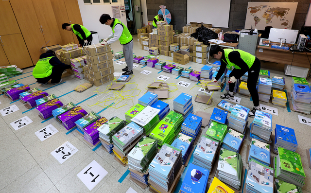 9일 대구 동구 대구관광고에서 대구학교지원센터 관계자들이 신학기를 앞두고 학생들에게 배부할 교과서 분류작업을 하고 있다.