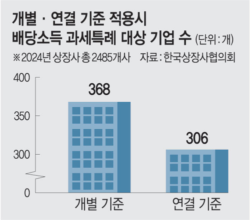 10일 한국상장회사협의회(상장협)에 따르면 정부가 입법예고한 ‘2025년 세제개편 후속 시행령 개정안’을 적용할 경우 배당소득 과세특례 대상 기업 수는 별도재무제표 기준 368곳에서 연결재무제표 기준 306곳으로 62곳(16.8%) 감소하는 것으로 추정된다. 전체 상장사(2485곳) 대비 수혜 기업 비중도 14.8%에서 12.3%로 낮아진다. 단순히 계산 기준을 바꾸는 것만으로 세제 혜택을 기대했던 기업 6곳 중 1곳이 탈락하는 셈이다.