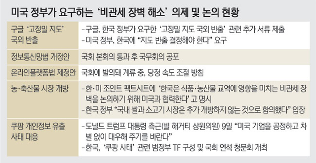 관세 재인상을 압박하는 미국이 ‘비관세 장벽 해소’를 선결 조건으로 제시하면서 1차 관문은 구글의 ‘고정밀 지도’ 국외 반출 여부가 될 것으로 보인다. 미 정부와 구글은 즉각 반출을 요구하는 반면, 우리 정부는 구글이 반출 허용을 위해 최근 제출한 서류를 토대로 추가 협의가 필요하다는 입장이다. 당정은 미국이 우려를 제기한 ‘온라인플랫폼법(온플법)’ 제정안 논의와 관련해서는 속도 조절에 나설 방침인 것으로 파악됐다.