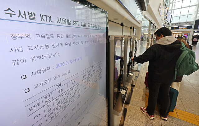 KTX·SRT 교차 운행 시범사업의 승차권 예매가 시작된 11일 서울역 전광판에 시범운행이 안내되고 있다.