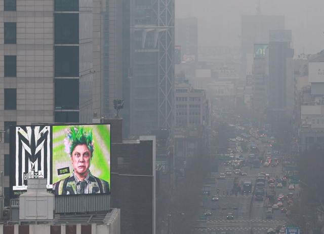 서울 및 수도권 지역 초미세먼지 농도가 ‘나쁨’ 수준을 보인 11일 오전 서울 종로구 서울시교육청에서 바라본 서울 도심이 온통 뿌연 모습이다.