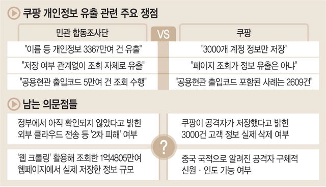 다만 쿠팡 측은 유출에 대한 해석을 달리하며 정부 발표를 정면 반박했다. 쿠팡은 “공격자가 개인정보 약 3370만 건에 대해 접근은 시도했으나, 이 중 약 3000개 계정 데이터만 실제 저장한 뒤 추후 이를 삭제했다”고 주장했다. 저장이 이뤄져야 유출로 볼 수 있다는 의미다. 반면 정부는 “저장 여부와 관계없이 페이지를 조회했다면 그 자체로 유출된 것”이라고 판단했다. 정부와 쿠팡이 이론을 보이는 쟁점 외에도 여전히 풀리지 않은 의문점도 적지 않다. 공격자가 로봇 프로그램으로 1억 회 이상 조회했다는 배송지 목록 페이지에서 실제 얼마나 많은 개인정보가 저장됐는지와 주소를 최대 20개까지 넣을 수 있는 배송지 목록 페이지에서의 추가 유출 여부 등은 추가 조사를 통해 규명되어야 할 부분이다.