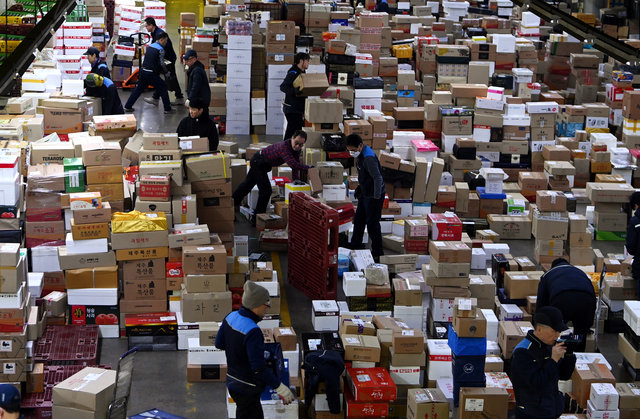 11일 오전 서울 광진구 동서울우편물류센터에서 직원들이 설 연휴를 앞두고 밀려든 택배 상자들을 분류하고 있다.