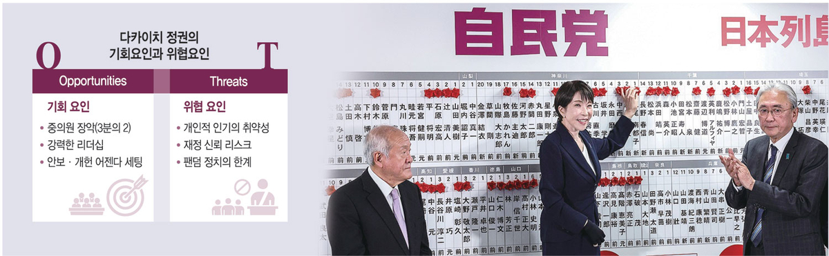 이번 지각 변동의 특징은 ‘호헌 대 개헌’으로 오랫동안 대립해 온 전후 일본 정치 구도에 종지부를 찍었다는 점이다. 전쟁 가능한 국가로의 회귀 등 ‘다카이치 색깔’을 선명히 할 수 있는 정책이 급격히 추진될 가능성이 커졌다. 그러나 경제가 정권의 발목을 잡을 수 있고, 개인플레이에 따른 인기가 얼마나 지속성을 가질 수 있을지도 의문이다.