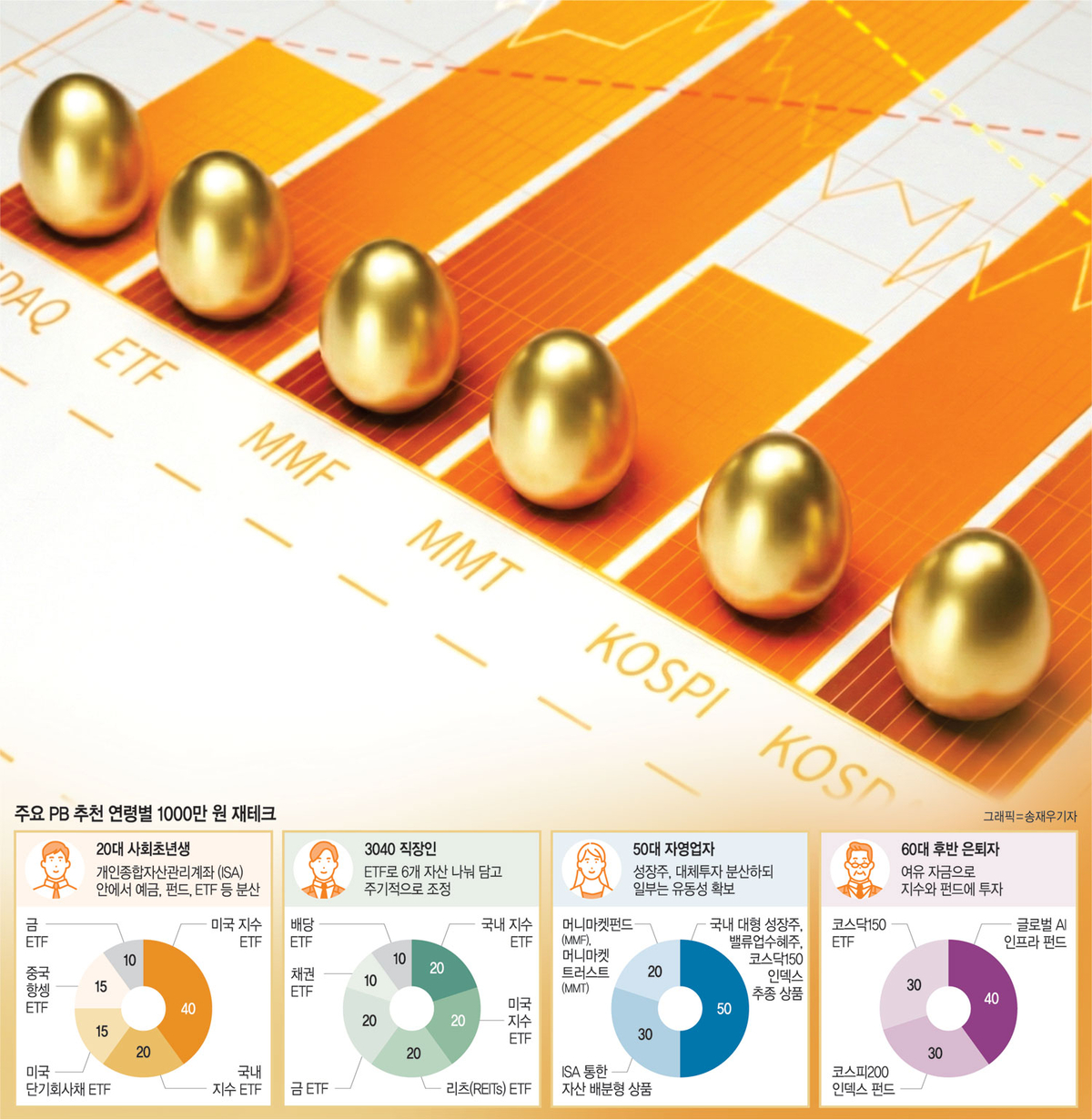 자영업자라는 직업적 특성상 소득이 경기 상황에 따라 변동성이 있을 수 있는 만큼, 여유자금 1000만 원을 장기간 묶어두기보다는 유동성 활용이 가능한 포트폴리오가 적당하다는 조언이다. 최진명 KB국민은행 서울숲 PB센터 팀장은 “지난해 코스피 상승률이 높았던 만큼, 특정 섹터를 고집하는 것보다는 대형 성장주, 밸류업 수혜주, 정부의 코스닥 지원정책 등을 고려해 분산투자하는 것이 좋을 것”이라고 말했다. 또한 ISA 상품을 통해 투자, 구체적으로는 미국 우량주와 금과 같은 대체자산을 함께 투자할 수 있는 자산배분형 상품을 추천했다. 정리하면, 1000만 원을 △국내 대형 성장주, 밸류업 수혜주, 코스닥150인덱스 추종상품으로 50% △ISA를 통해 미국 성장 우량주와 금 등 대체자산을 함께 투자하는 자산배분형 상품에 30% △유동성 자산인 머니마켓펀드(MMF), 머니마켓트러스트(MMT)와 같은 입출금식 통장에 나머지 20%를 예치하는 것이다.