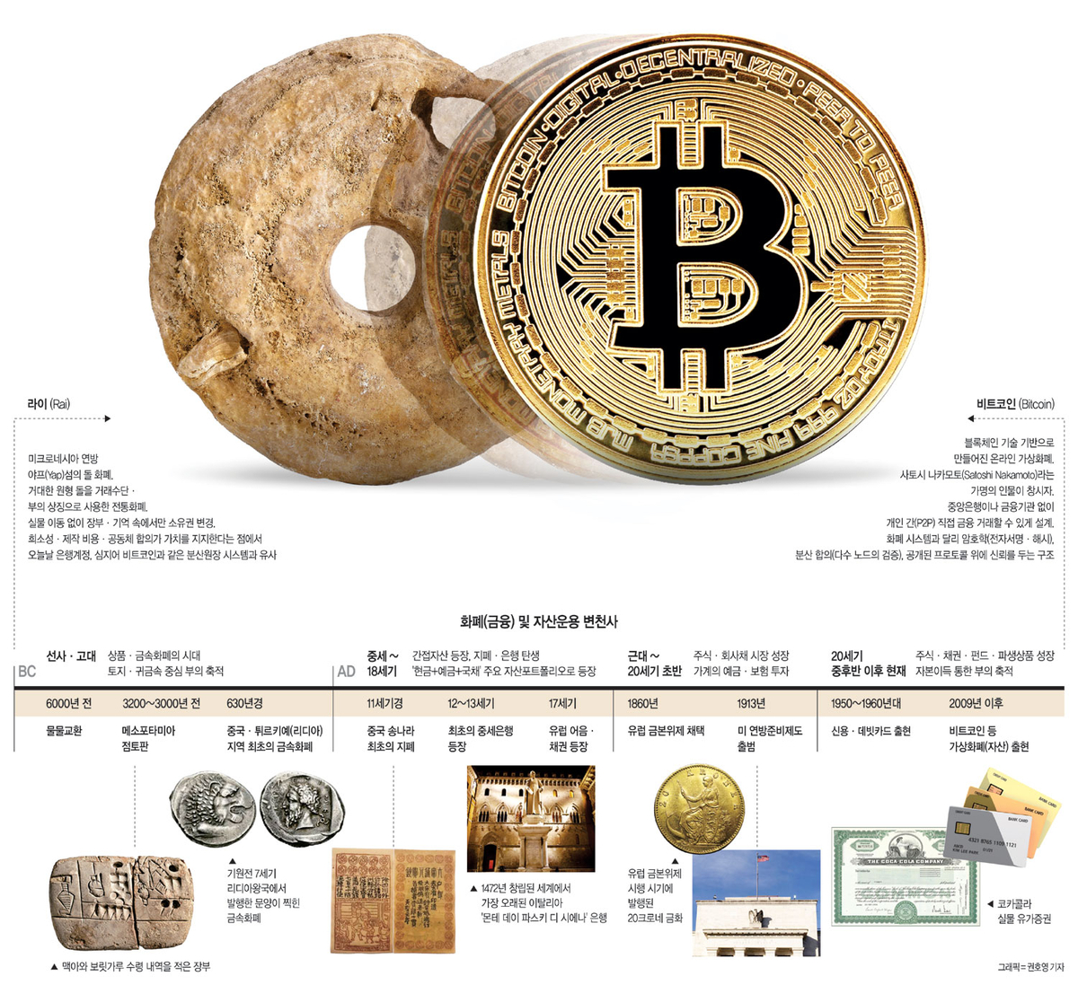 시카고학파의 거두 밀턴 프리드먼은 저서 ‘화폐경제학’의 첫 장에서 미크로네시아 캐롤라인 제도에 있는 ‘야프(Yap)’섬 주민들이 커다란 석회석을 가공해 화폐로 사용했다는 이야기를 소개한다. 서기 500∼1000년 전쯤이다. 중앙에 구멍을 내서 바퀴 모양으로 만들었는데, 큰 것은 지름이 3.6m에 달하고 무게는 12t이나 됐다. 라이 스톤(Rai Stone)으로 부른다. 흥미로운 사실은 거래할 때 돌을 주고받지 않았다는 점이다. 돌은 그 자리에 있고 소유권을 기록만 하면 됐다. 프리드먼이 이야기하고 싶은 사실은 화폐를 관통하는 본질이 ‘신뢰’라는 것이다. 결국 돈의 역사는 ‘부를 저장하는 그릇’으로서 ‘사람들이 무엇을 믿었는지’에 대한 변천사다.
