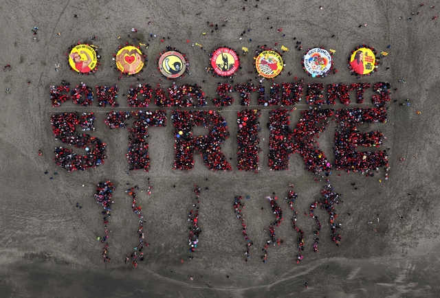 11일 약 50년 만에 처음으로 파업에 돌입한 미국 캘리포니아주 샌프란시스코의 공립학교 교사들이 오션비치에 모여 ‘STRIKE’(파업)라는 글자를 만들고 있다. 임금, 건강보험 등을 둘러싼 교육청과의 협상이 결렬되면서 약 6000명의 샌프란시스코 통합교육구(SFUSD) 소속 직원들이 사흘째 파업을 벌이고 있다.