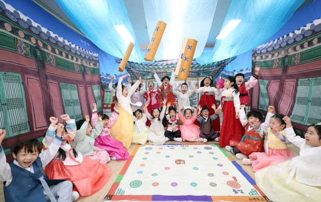 11일 부산 부산진구청 어린이집에서 설을 맞아 한복을 입은 아이들이 윷놀이 도중 기념촬영을 하고 있다.