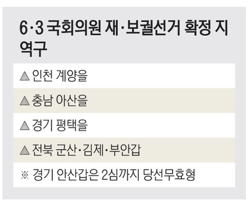 이에 더해 현재 양문석 민주당 의원은 선거법 위반 혐의 재판에서 2심까지 당선 무효형을 선고받아 경기 안산갑에서도 선거가 치러질 가능성이 있다. 현역 의원이 지방자치단체장에 출마할 경우 지방선거 30일 전(5월 4일)까지 의원직을 사퇴해야 해 인천, 경기, 부산, 전남, 광주 등도 예정 지역구로 거론된다.