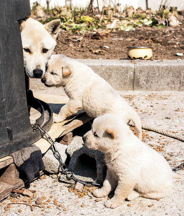고무통을 개조해 만든 작은 집 안에서 진돗개 어미가 얼굴을 빼꼼 내민다. 몸은 안쪽에 숨긴 채, 마당을 조용히 내다본다. 새끼 한 마리가 다가와 어미의 얼굴에 코를 맞대고 천천히, 조심스레 비빈다. 어미는 눈을 가늘게 뜬 채 아무 말 없이 그 온기를 받아준다. 옆에서는 다른 새끼가 멀뚱히 앉아 그 모습을 지켜본다. 다가가지도, 돌아서지도 못한 채 잠시 멈춘 시간. 같은 자리에서 서로 다른 방식으로 어미 곁에 머물고 있다.