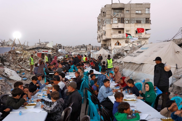 무슬림 금식 기간인 라마단이 시작된 18일 가자시티에서 팔레스타인 주민들이 튀르키예 IHH 재단이 마련한 이프타르(라마단 기간 해질녘에 먹는 저녁 식사)를 먹고 있다. 지난해 10월 휴전 이후 처음으로 맞는 라마단 금식 후 첫 끼니인 이날 이프타르에는 고기와 쌀, 대추야자 등이 제공됐다.