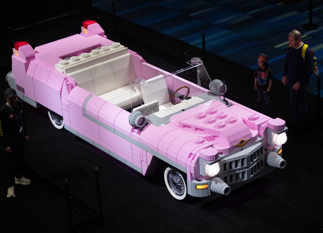 18일 캐나다 토론토에서 열린 ‘2026 캐나다 국제 오토쇼’에서 관람객들이 레고 41만8000개로 만들어진 1950년대 캐딜락 컨버터블 모형을 구경하고 있다.