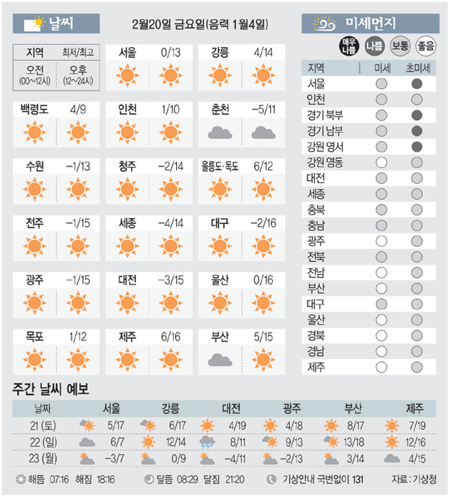 [날씨이야기] 2월20일 금요일(음력 1월4일)