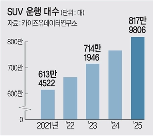 23일 자동차 시장조사업체 카이즈유데이터연구소에 따르면, 지난해 SUV 운행 대수는 817만9806대로 집계됐다. 1년 전인 2024년(766만8617대) 대비 약 6.7% 증가한 수치로, 사상 처음으로 800만 대를 넘어섰다. 연간 SUV 운행 대수는 △2021년 613만4522대 △2022년 663만1093대 △2023년 714만1946대 순으로 꾸준히 늘었다.