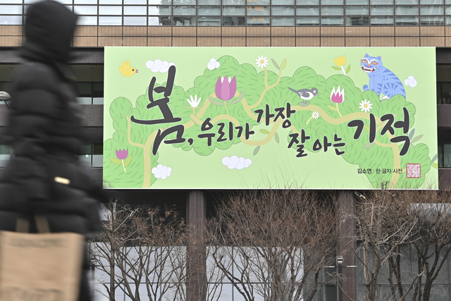 3일 오전 서울 종로구 교보생명 빌딩 외벽 광화문글판에 김소연 시인의 시 ‘한 글자 사전’에서 발췌한 봄편이 게시돼 있다.