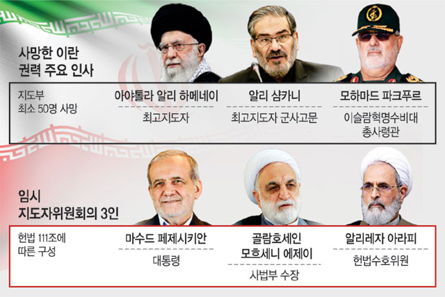 공습 시작과 동시에 아야톨라 알리 하메네이 최고지도자를 비롯해 이란 군·정부 주요 인사들이 대거 폭사한 배경에는 미군의 대규모 중동 집결 소식에도 한자리에 모여 회의를 강행한 이란 수뇌부의 치명적 오판이 있었다. 37년간 통치해온 최고지도자를 잃은 이란은 3인으로 구성된 임시 지도자위원회를 구성하는 등 내부 수습과 신정체제 수호를 위해 안간힘을 쓰고 있다. 수일 내 새 최고지도자가 선출될 가능성이 높은 상황 속에 하메네이 최고지도자의 후계자로 대중에 잘 알려지지 않은 반미 강경파 성직자인 알리레자 아라피 헌법수호위원이 급부상하고 있다.