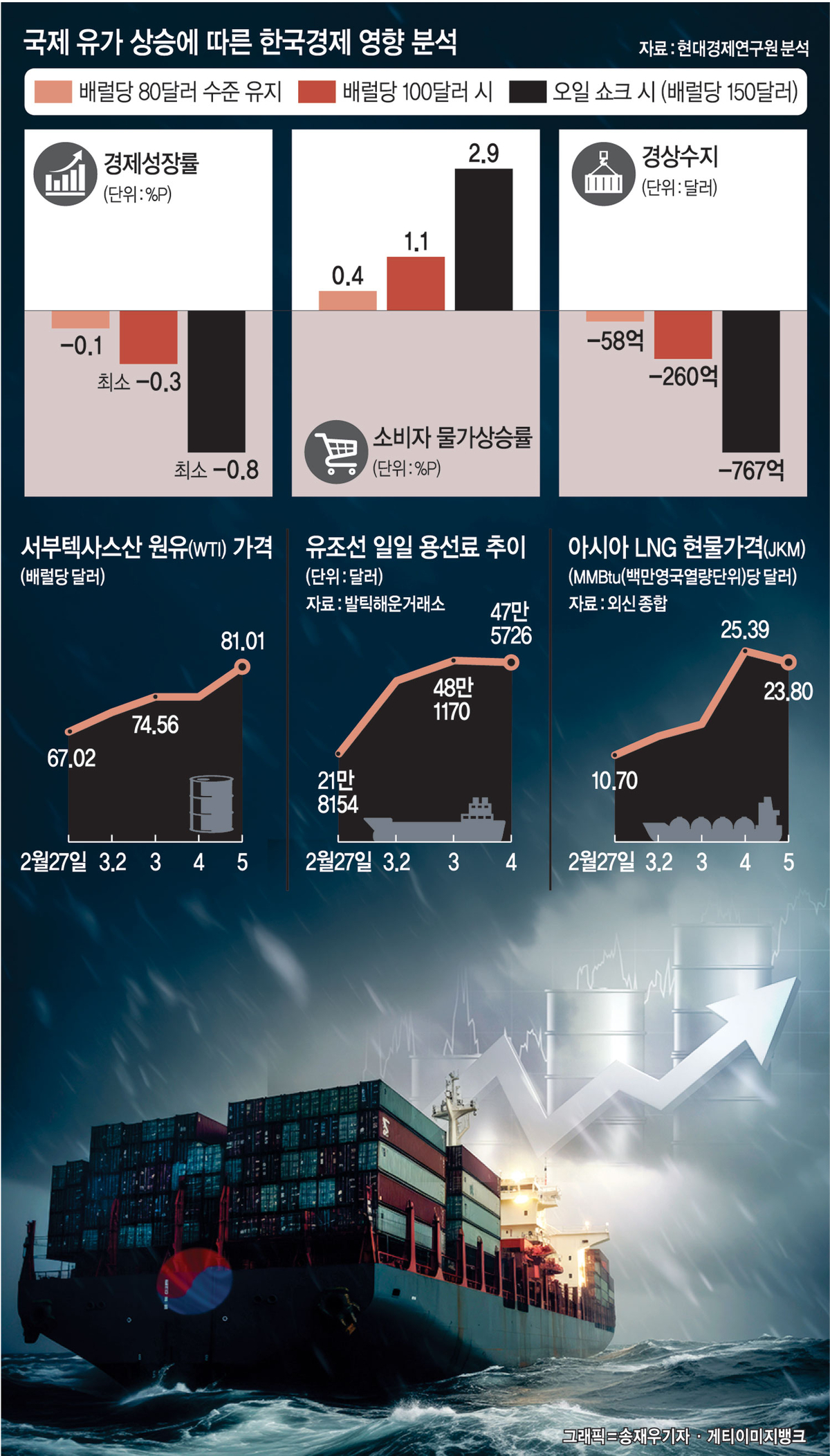 미국·이란 전쟁 여파로 국제 유가와 해상 운임이 동시에 급등하면서 글로벌 에너지 시장과 공급망을 뒷받침하는 물류망이 요동치고 있다. 호르무즈 해협 봉쇄로 유조선 운임은 하루 40만 달러(약 6억 원)까지 치솟는 등 사상 유례없는 수준으로 폭등했고, 국제 유가는 배럴당 80달러를 돌파하는 등 1년 8개월 만에 최고치를 기록했다. 유가와 운임 등이 동시에 상승하면서 산업계에서는 주요 수출 기업이 타격을 입고 저성장·고물가의 스태그플레이션 위험이 커질 수 있다는 우려가 나오고 있다.