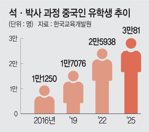 국회 교육위원회 김민전 국민의힘 의원이 9일 교육부로부터 받은 자료에 따르면, 지난해(4월 1일 기준) 석·박사 과정 중국인 유학생은 3만81명으로 집계됐다. 2016년 1만1250명에 비해 167% 증가한 숫자다. 지난해 전체 석·박사 유학생(5만9040명)의 절반을 넘긴 숫자다. 중국인 석·박사 유학생은 2020년 2만 명을 넘어섰고, 지난해 처음으로 3만 명을 돌파했다. 전체 외국인 석·박사 유학생 중 중국인이 차지하는 비율도 해마다 높아져 2022년 59.2%를 기록했다 최근 비중이 다소 줄었다.