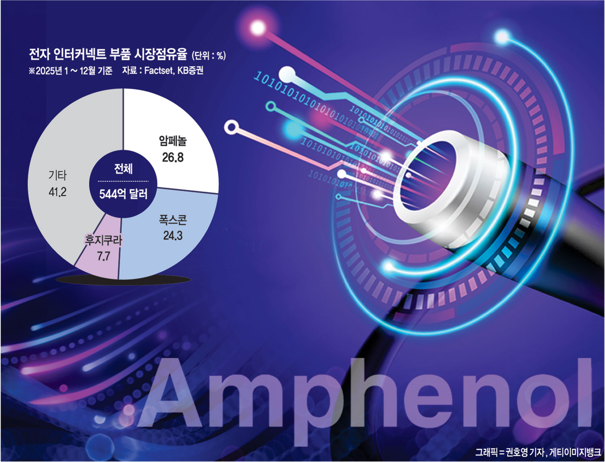 암페놀은 1932년에 설립돼 올해로 90년이 넘은 기업인데, AI 시대가 열리면서 오히려 더 주목받고 있다. 한마디로 정의하면 ‘연결 부품 전문 기업’이다. 전기든, 빛이든, 무선이든 신호가 흐르는 곳이라면 암페놀의 부품이 어딘가에 끼어 있다. 우리가 매일 쓰는 스마트폰, 노트북, 자동차, 전투기까지 모든 전자기기 안에는 수많은 부품이 서로 신호를 주고받는다. 암페놀은 그 신호가 오가는 통로를 만드는 회사다. 그래픽처리장치(GPU)가 AI의 두뇌라면, 암페놀이 만드는 부품은 그 두뇌를 연결하는 신경망이다. 화려하게 주목받는 반도체 기업들 뒤에서 데이터가 실제로 흐르는 통로를 조용히 장악해온 기업, 암페놀은 ‘광 연결산업의 숨은 강자’로 불린다.