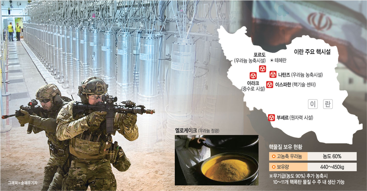이란이 보유하고 있는 고농축 우라늄은 수주 내에 무기급인 농도 90%까지 추가 농축이 가능하다. 이러한 고농축 우라늄 중 상당량은 중부 이스파한에 위치한 핵시설 지하에 있는 것으로 추정된다. 나머지 일부는 각각 포르도, 나탄즈 핵시설에 보관돼 있는 것으로 알려졌다. 미군은 지난해 6월 ‘미드나이트 해머’ 작전 당시 B-2 스피릿 스텔스 폭격기와 GBU-57 벙커버스터 등을 활용해 이들 시설을 폭격했으나, 고농축 우라늄 상당량과 농축시설은 여전한 것으로 전해졌다.