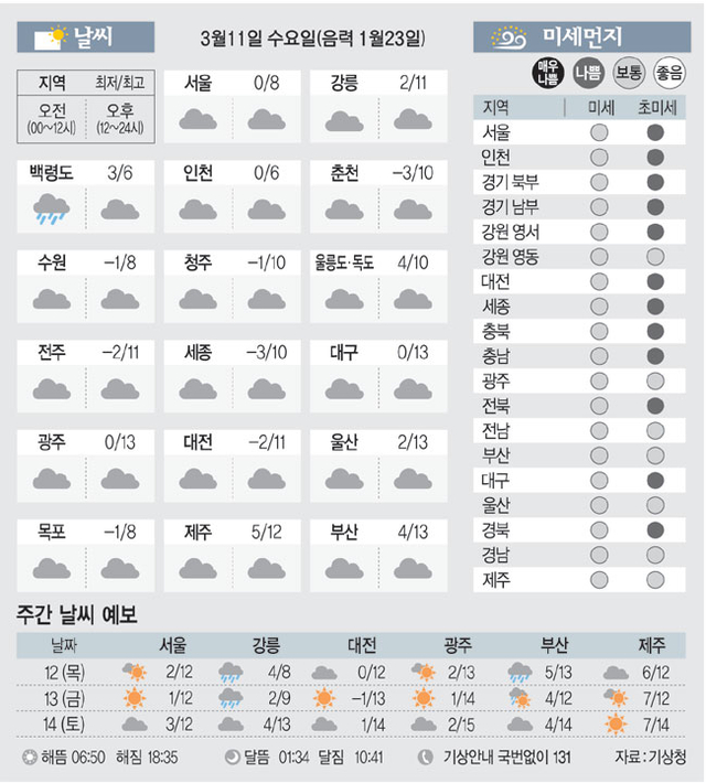 [날씨이야기] 3월11일 수요일(음력 1월23일)