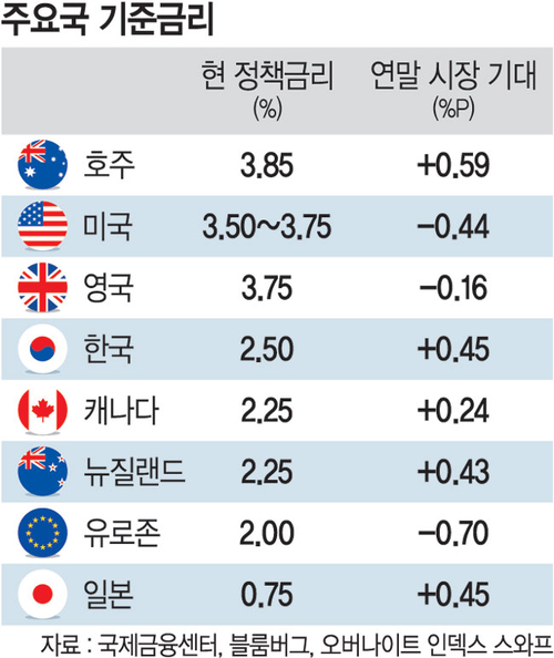 미국·이란 전쟁 여파로 주요국 중앙은행들의 통화 정책 흐름이 완화(기준금리 인하)에서 긴축(기준금리 인상)으로 바뀌고 있다는 분석이 나왔다. 시장에서는 한국의 기준금리 역시 연말에는 현재보다 높은 수준일 것으로 전망하고 있다.
