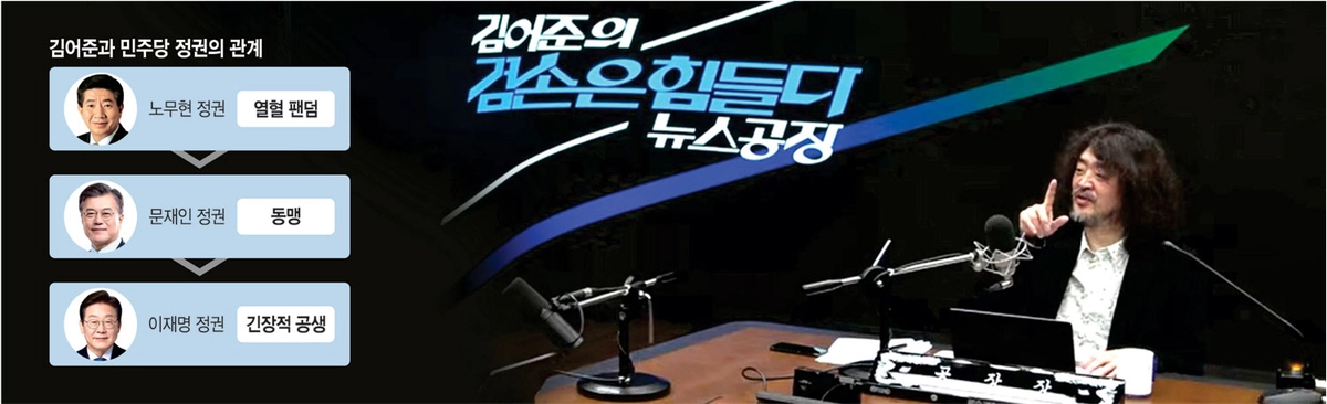 진보 정치권에는 어느새 ‘김어준 생태계’가 형성됐다. 민주당 정치인들은 그의 방송에 출연해야 정치 인증을 받을 수 있었다. 정청래 민주당 대표가 당대표 경선에서 그의 지원을 받아 당선된 것도 널리 알려진 사실이다. 권리당원 중심의 당 구조가 강화되는 과정에서도 그의 영향력이 상당히 작용했다. 심지어는 이 대통령도 취임 전 수차례 그의 스튜디오를 찾았다.