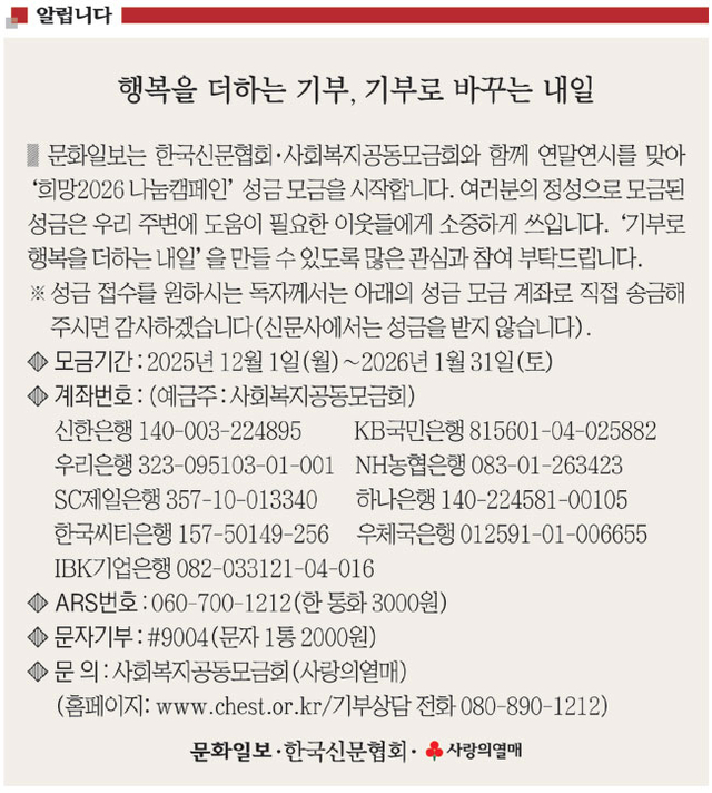문화일보는 한국신문협회·사회복지공동모금회와 함께 연말연시를 맞아 ‘희망2026 나눔캠페인’ 성금 모금을 시작합니다. 여러분의 정성으로 모금된 성금은 우리 주변에 도움이 필요한 이웃들에게 소중하게 쓰입니다. ‘기부로 행복을 더하는 내일’을 만들 수 있도록 많은 관심과 참여 부탁드립니다.